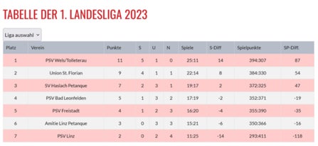Auf Platz 2 landet der PSV Freistadt in der 1. Landesliga. Eine spannende und knappe Schlusstabelle zeigt die sportliche Ausgeglichenheit der Mannschaften.